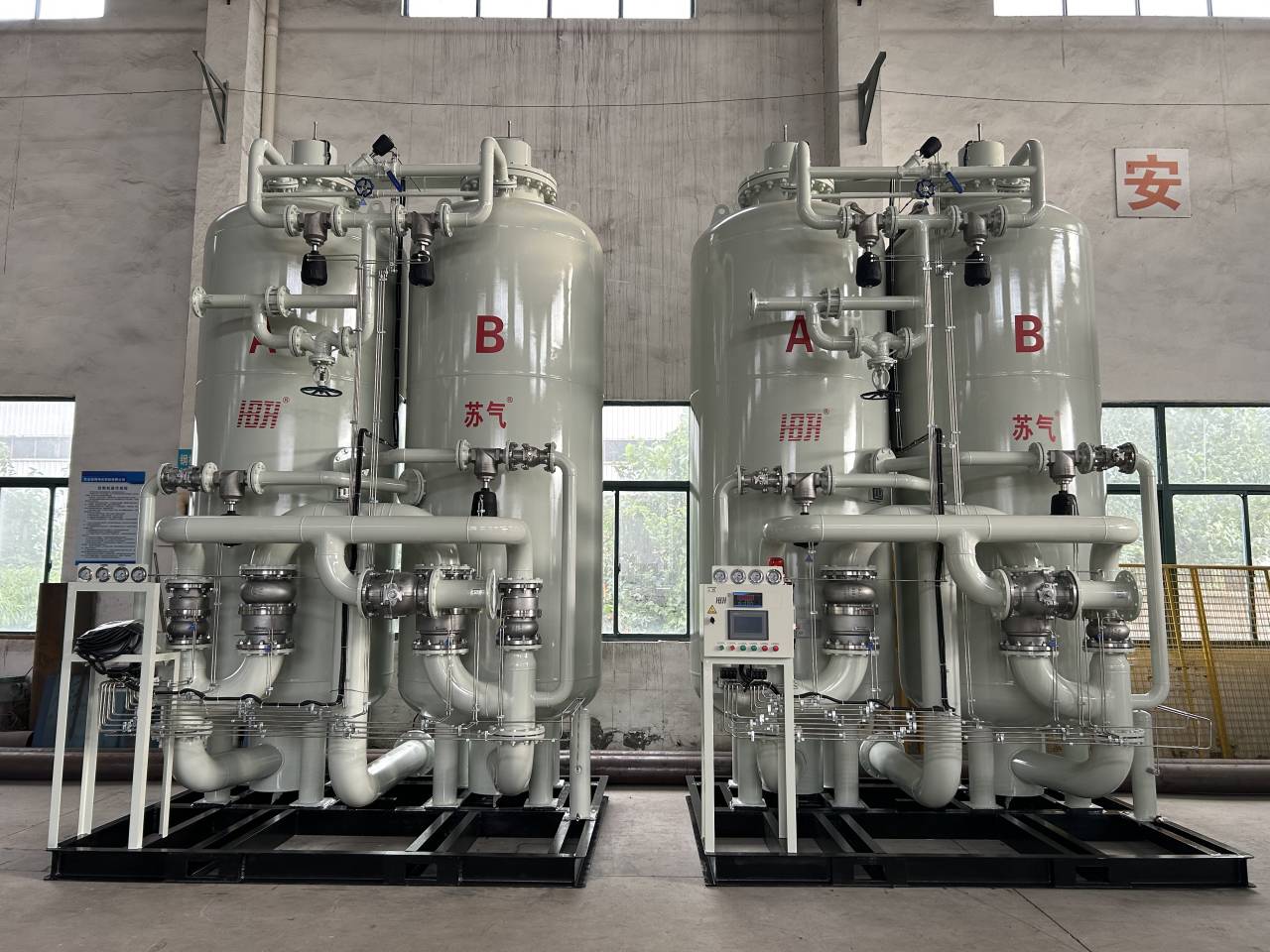 環(huán)境空氣經(jīng)壓縮凈化,除去油、水、塵后,進(jìn)入由兩個(gè)裝填有碳分子篩的吸附塔組成的變壓吸附裝置。壓縮空氣由下至上流經(jīng)吸附 塔,其間氧分子在碳分子篩表面吸附,氮?dú)庥晌剿隙肆鞒?,進(jìn)入粗氮緩沖罐,經(jīng)過一段時(shí)間后,吸附塔中碳分子篩被吸附的氧飽和,需進(jìn)行再生。再生是通過停止吸附步驟,降低吸附塔壓力來實(shí)現(xiàn)的。兩個(gè)吸附塔交替進(jìn)行吸附和再生,從而確保氮?dú)獾倪B續(xù)輸出。